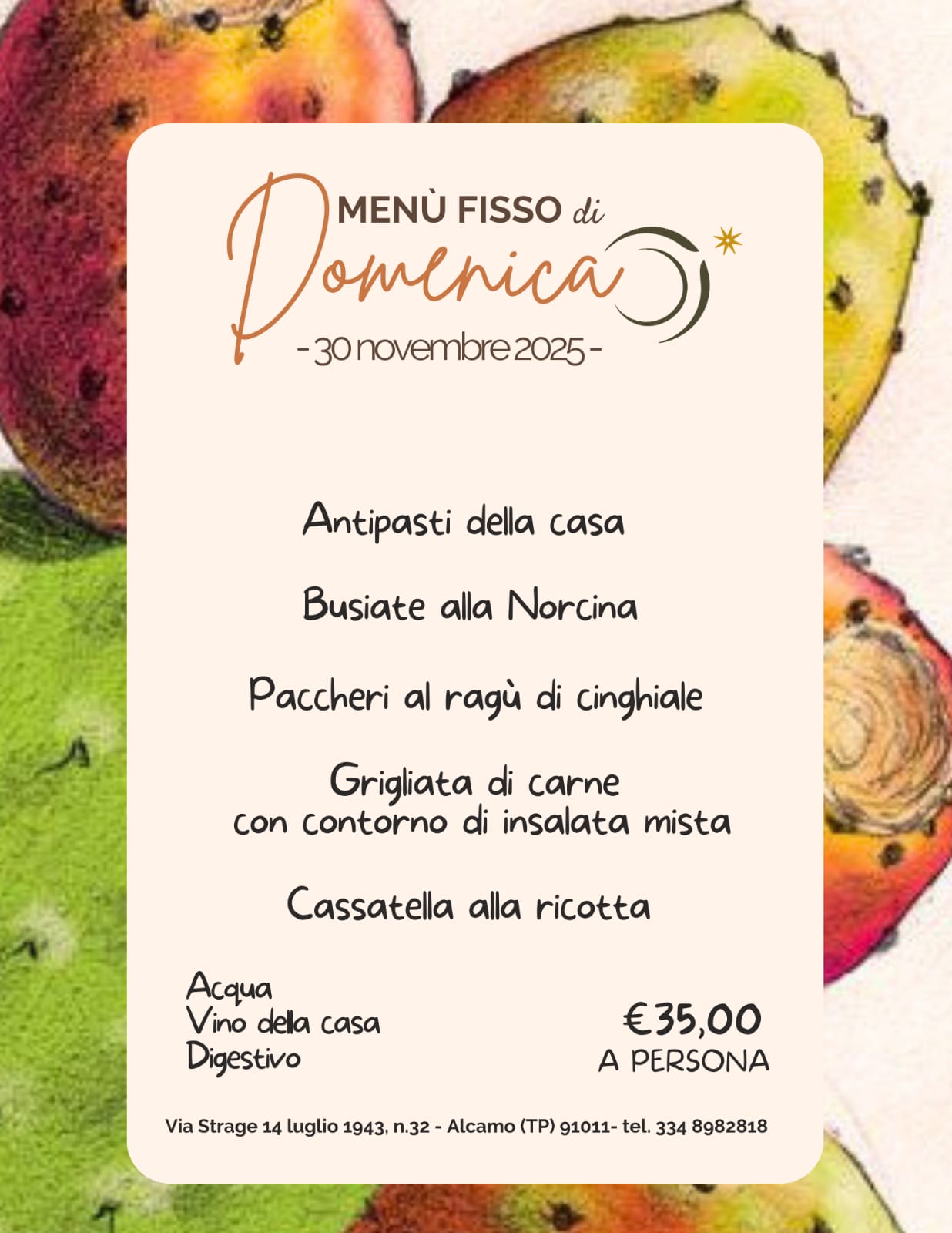 N.B. La Domenica a pranzo c'è solo il menù fisso; il menù fisso non è divisibile; il menù fisso è obbligatorio per ciascun commensale; i bambini a partire dai 6 anni hanno il menù bambini obbligatorio.